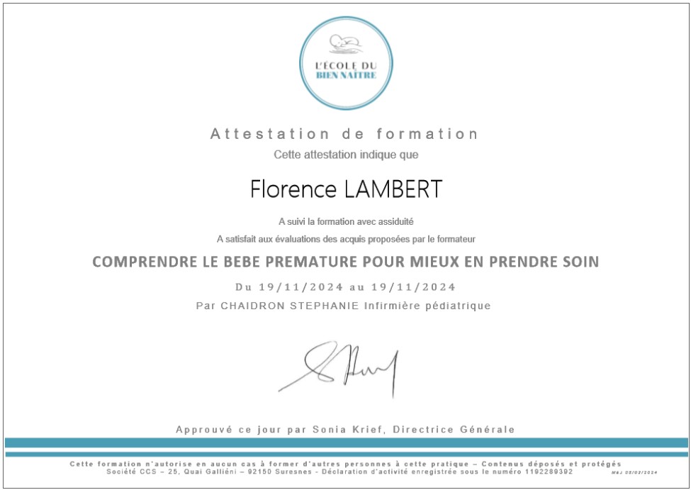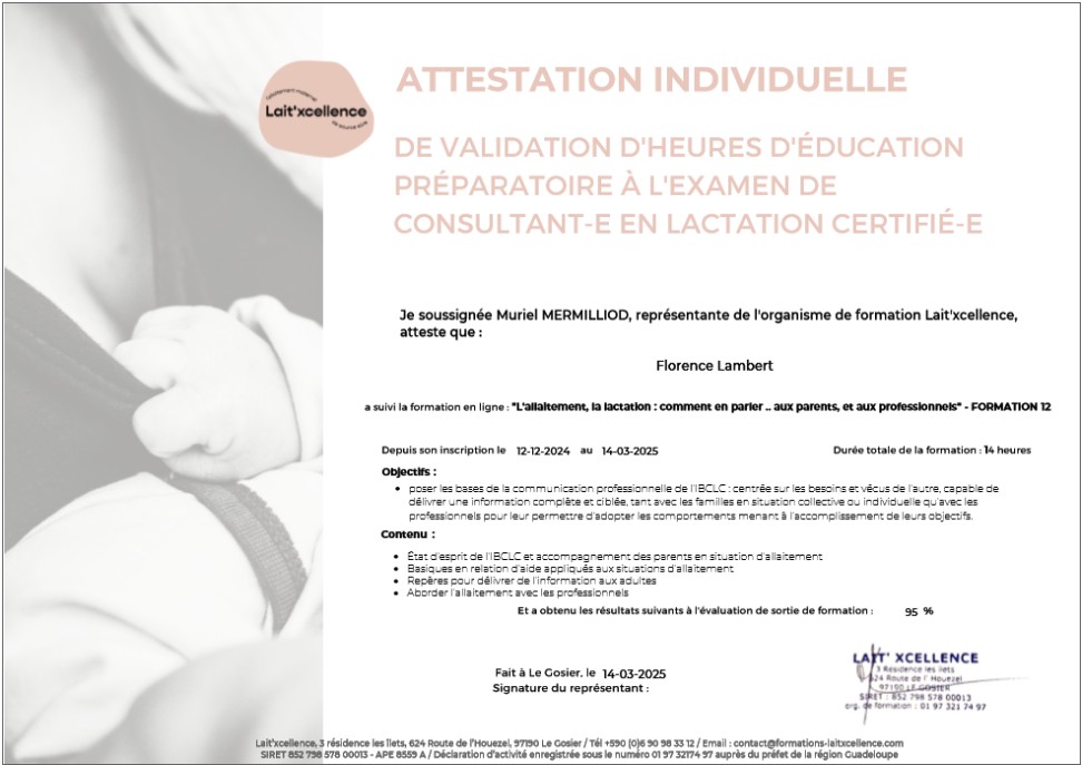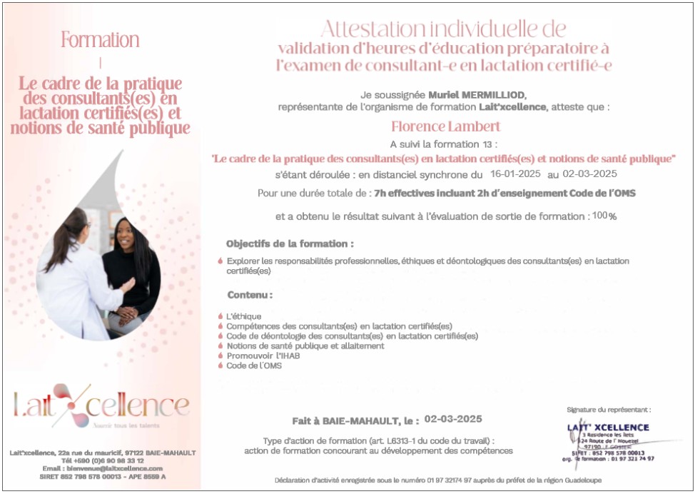 attestation de formation CONSULTANTE EN LACTATION CERTIFIéE (250h)